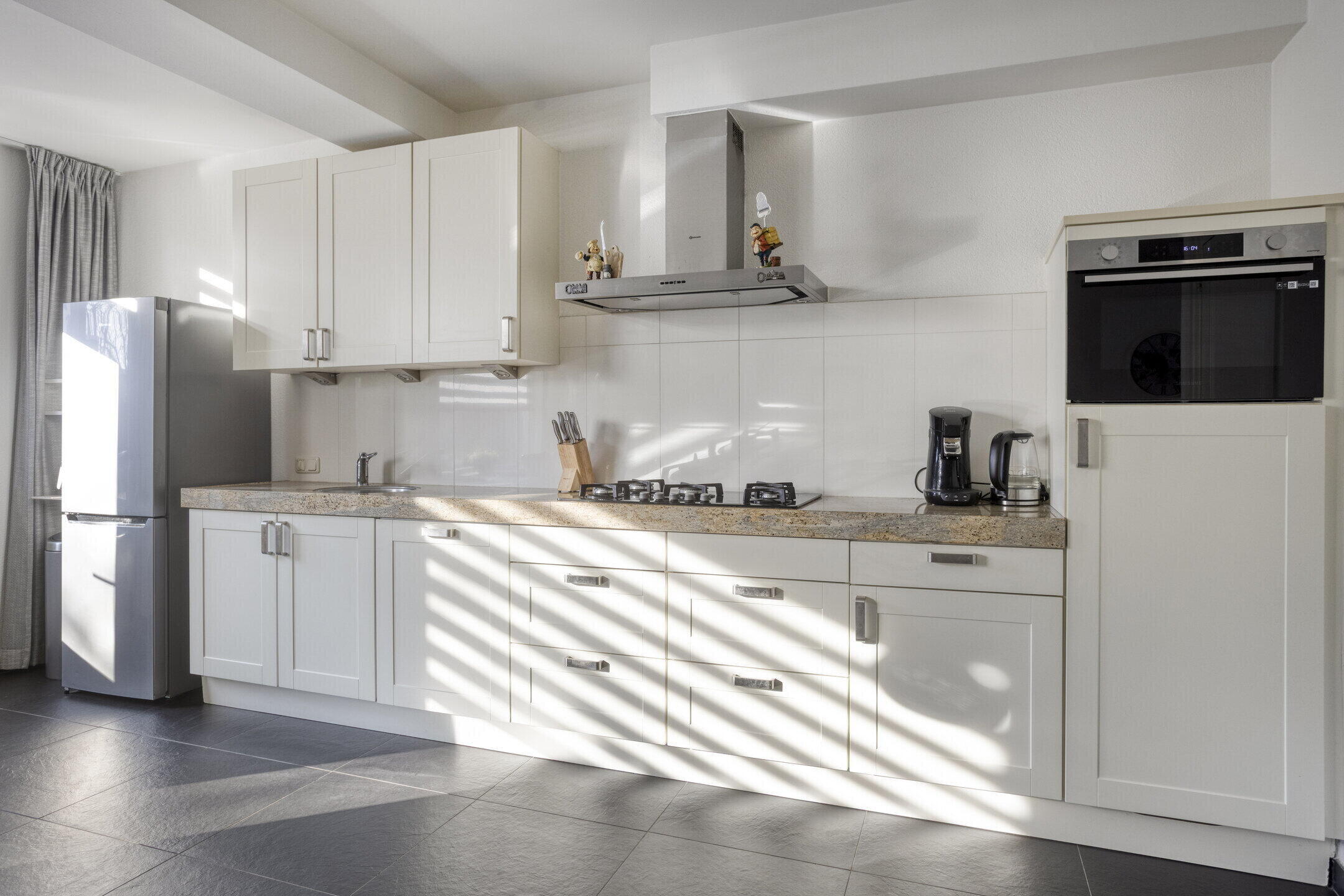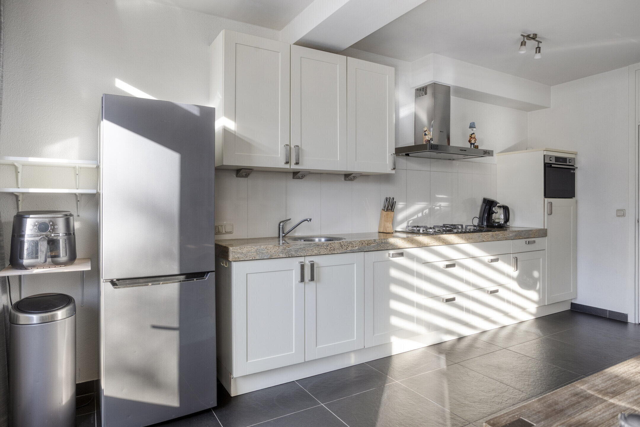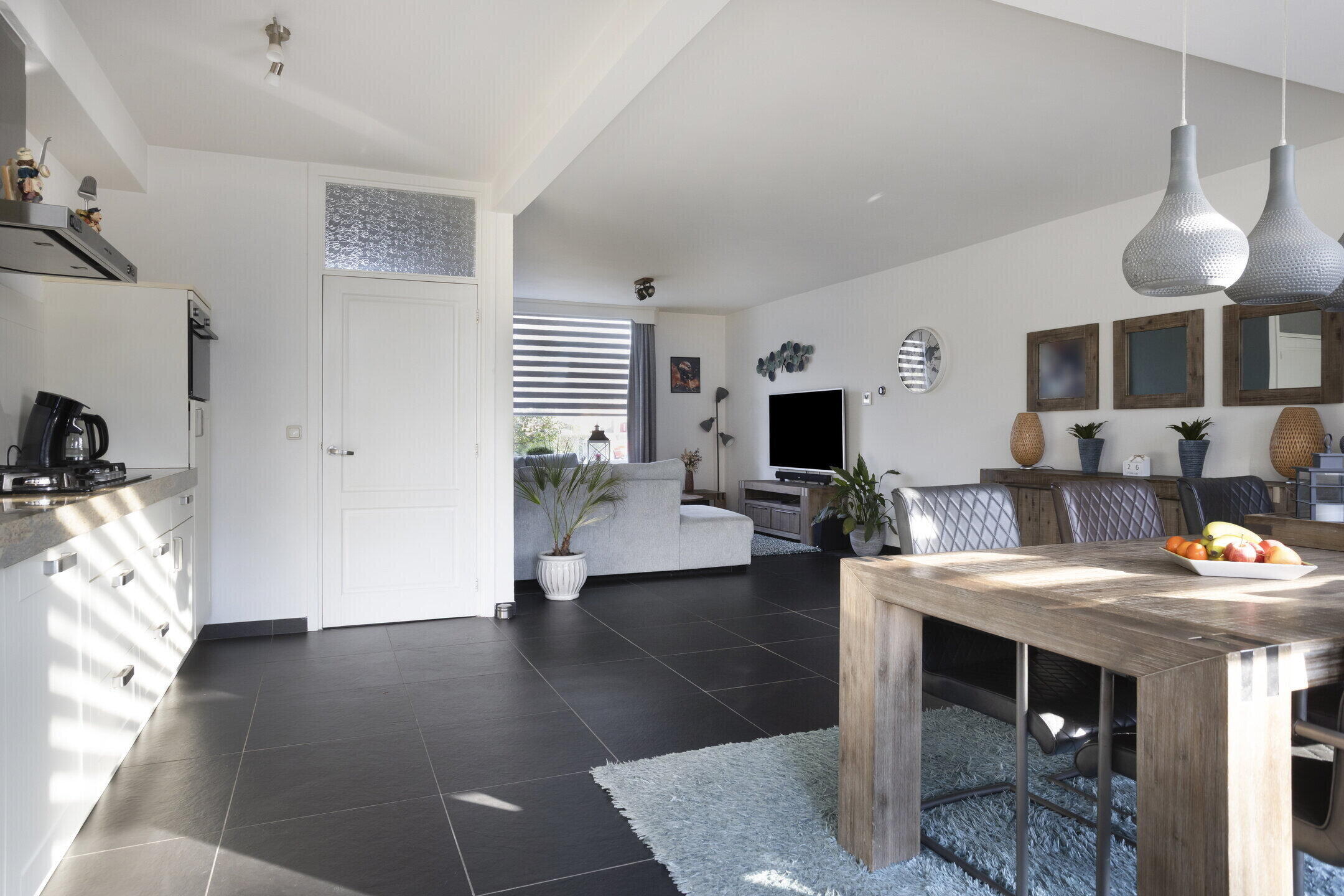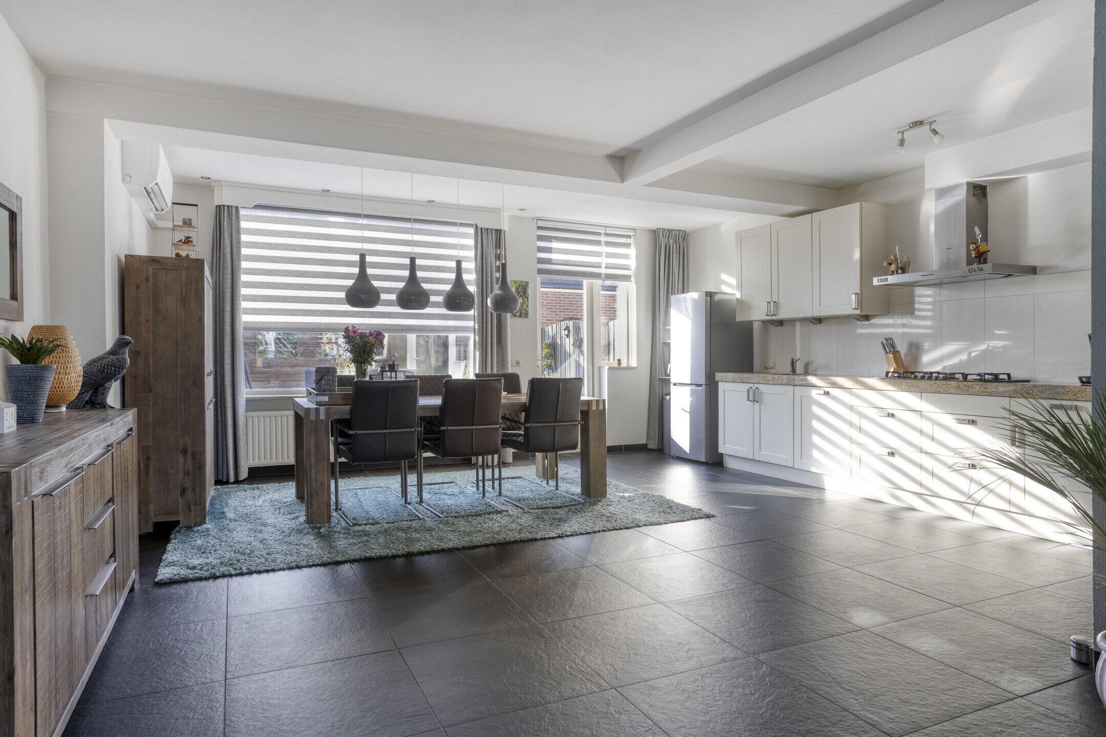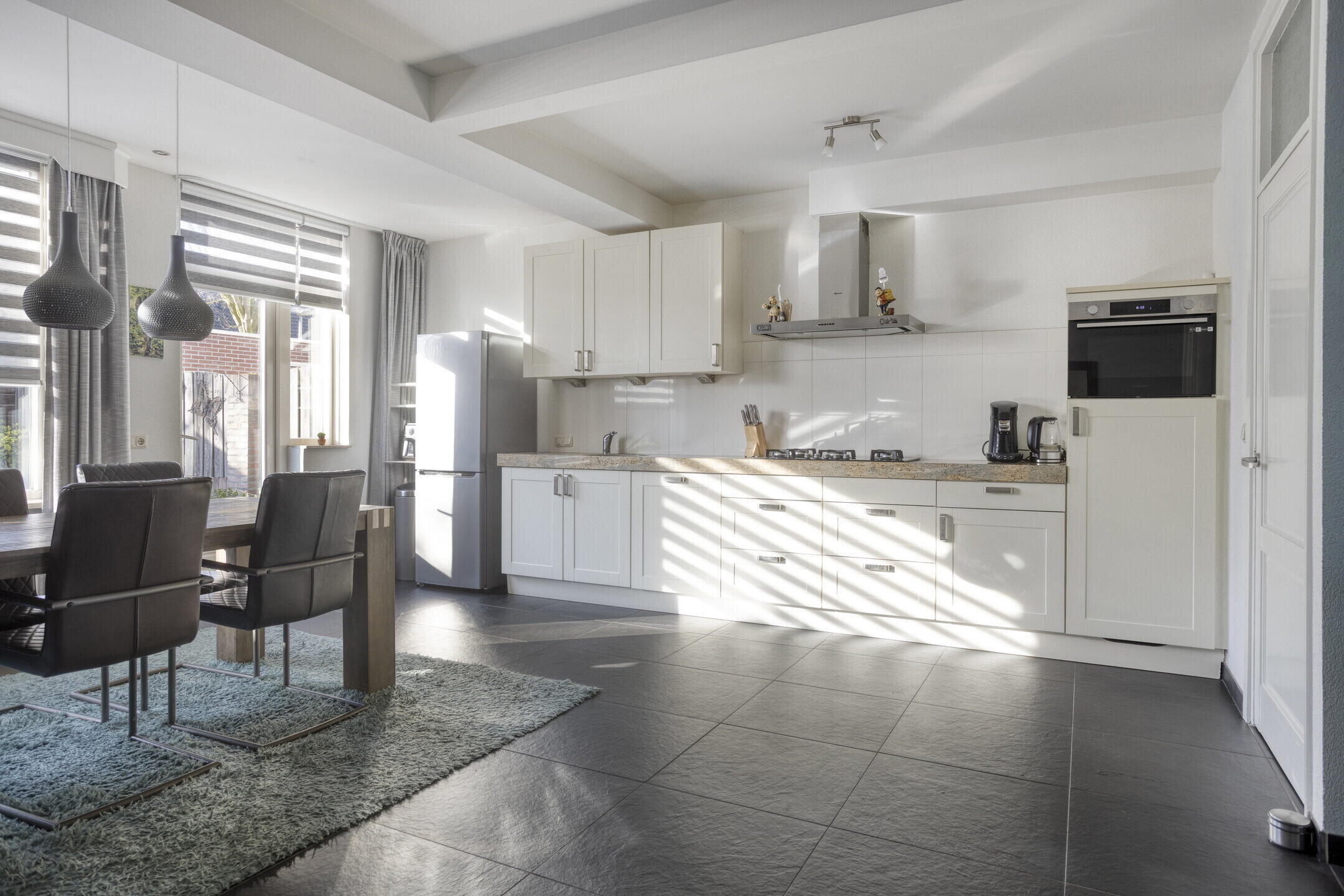 De woonkamer biedt volop ruimte voor een gezellige zithoek en een grote eettafel waar je met familie en vrienden kunt genieten van lange avonden tafelen. Aan de achterzijde bevindt zich de open keuken, uitgevoerd in een lichte crèmekleurige opstelling. De keuken is praktisch ingericht en voorzien van diverse inbouwapparatuur zoals een 5-pits gaskookplaat, combi-oven en vaatwasser. Hier kook je met gemak de lekkerste maaltijden terwijl je contact houdt met het gezin of gasten aan de eettafel.