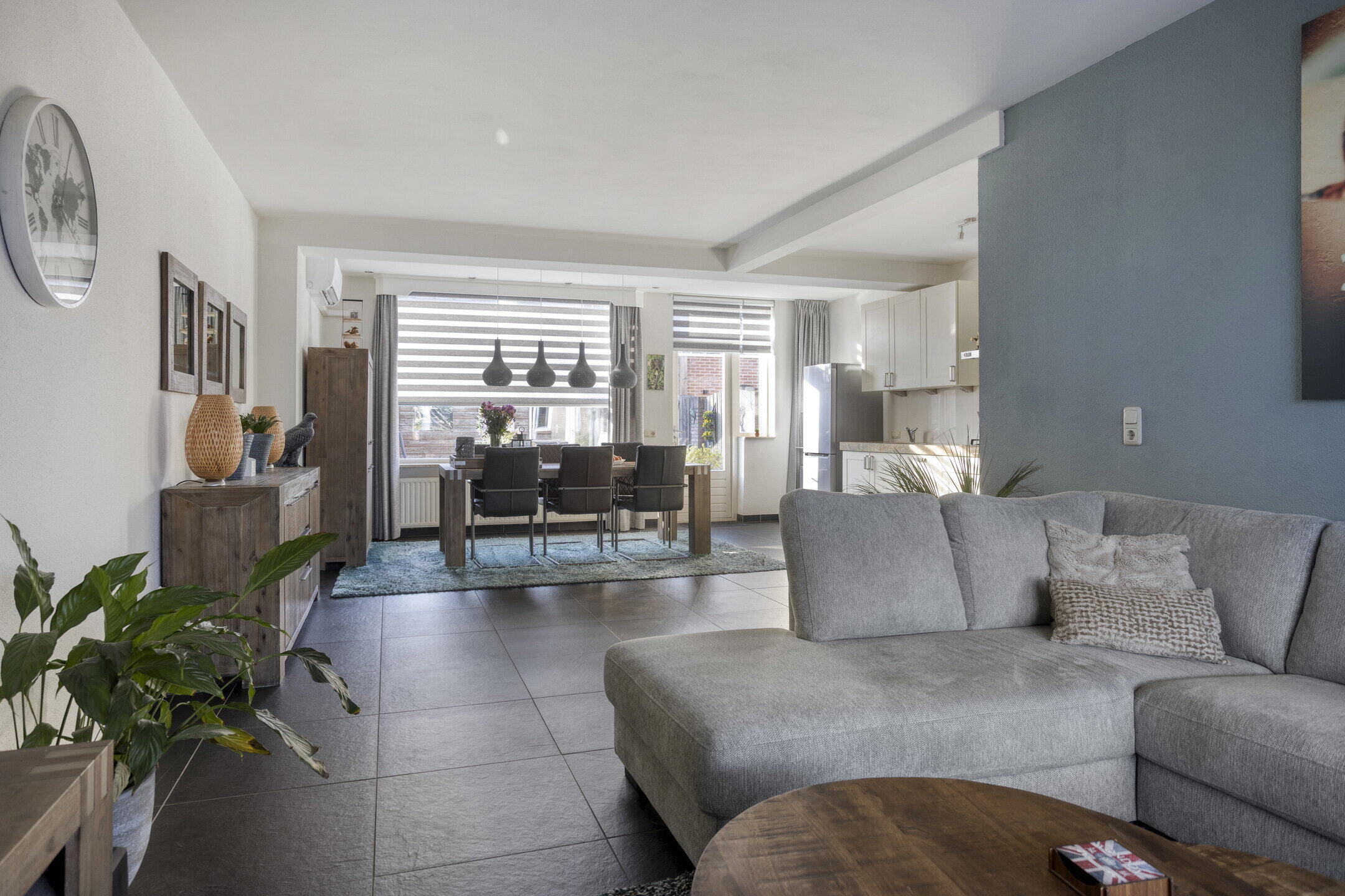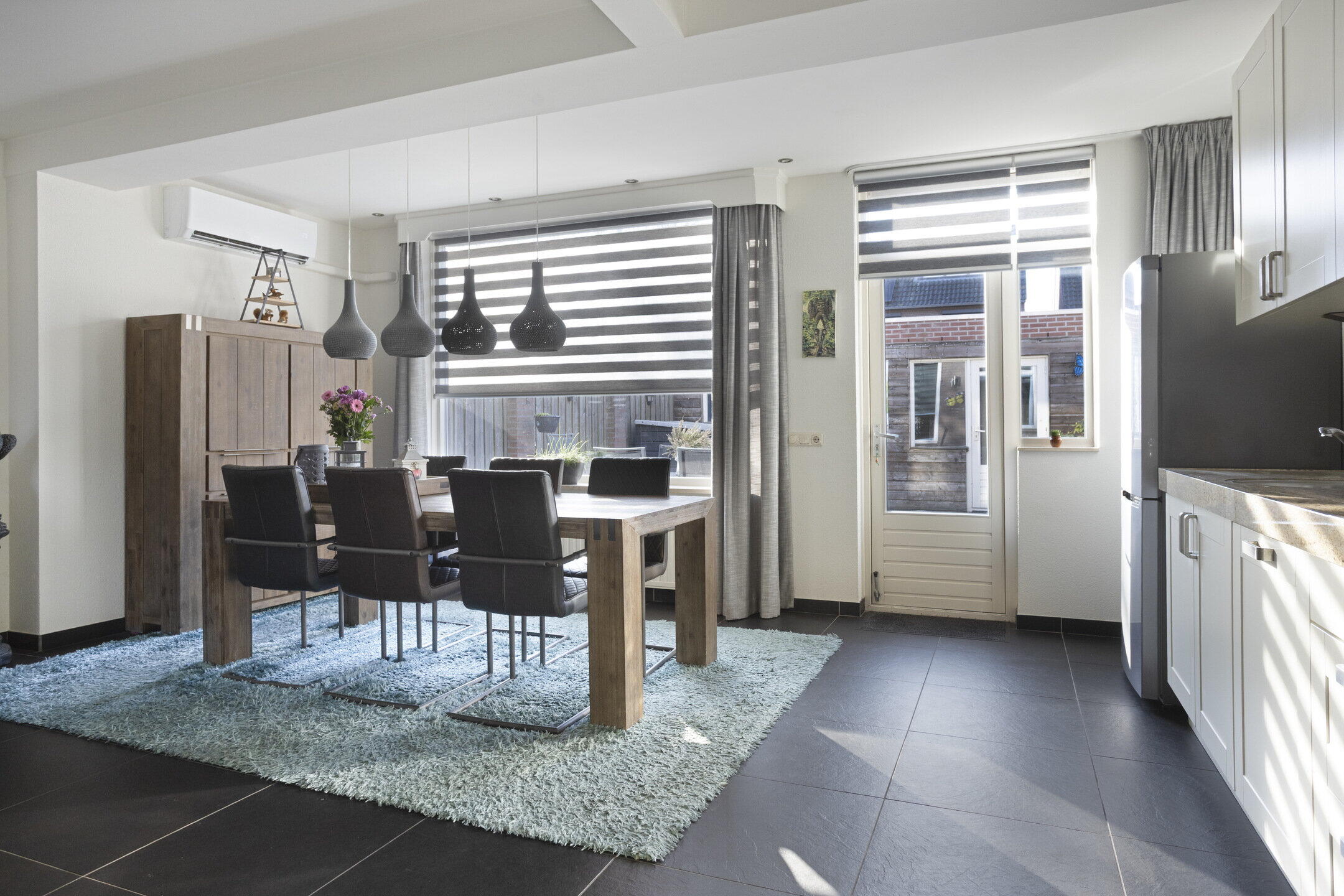 Direct valt de ruimte op. De begane grond is aan de achterzijde uitgebouwd, waardoor er een royale leefruimte is ontstaan. De vloer is afgewerkt met stijlvolle antracietkleurige tegels, wat zorgt voor een moderne en praktische uitstraling. De wanden zijn strak afgewerkt en dankzij de grote ramen valt er veel daglicht naar binnen. Bovendien is de woonkamer voorzien van airconditioning, wat het hier het hele jaar door comfortabel maakt.