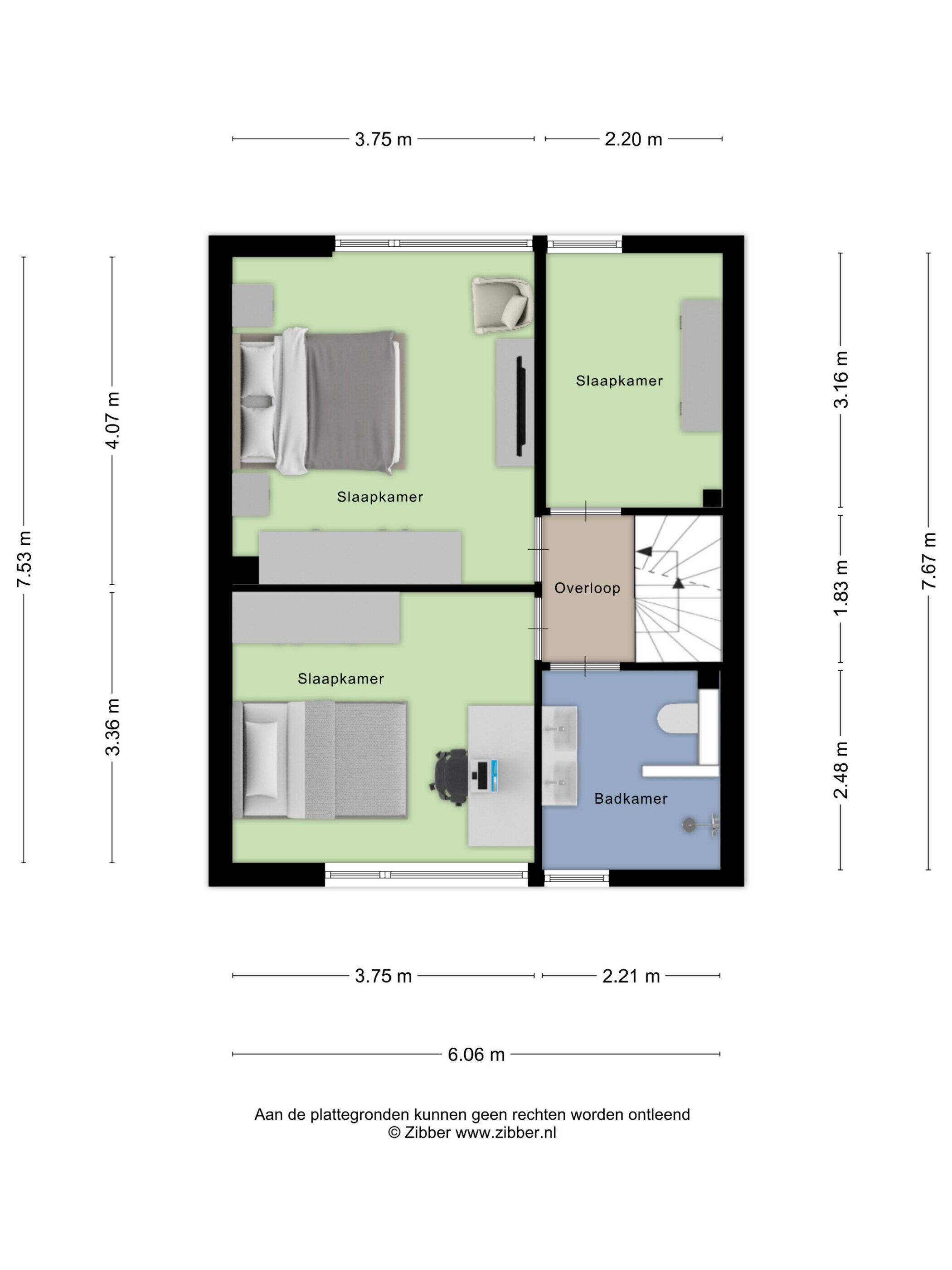 Via de trap in de hal bereik je de eerste verdieping. De overloop geeft toegang tot drie slaapkamers en de badkamer.